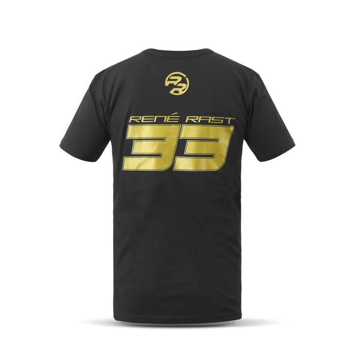 We are the Champions! Spüre den Gewinnerspirit und sei Teil des perfekten Sieges von Rene Rast auf dem Hockenheimring bei der DTM. In goldenem Print leuchtet Rene Rast und sein Rennauto auf dem edlen schwarzen T-Shirt, denn Gold ist die Farbe der Champions. Auf dem Rücken erstrahlt groß die bekannte Startnummer 33. Dieses T-Shirt ist ein absolutes Must-have und Sammlerstück für jeden Rene Rast Fan. Material: 100 % Baumwolle